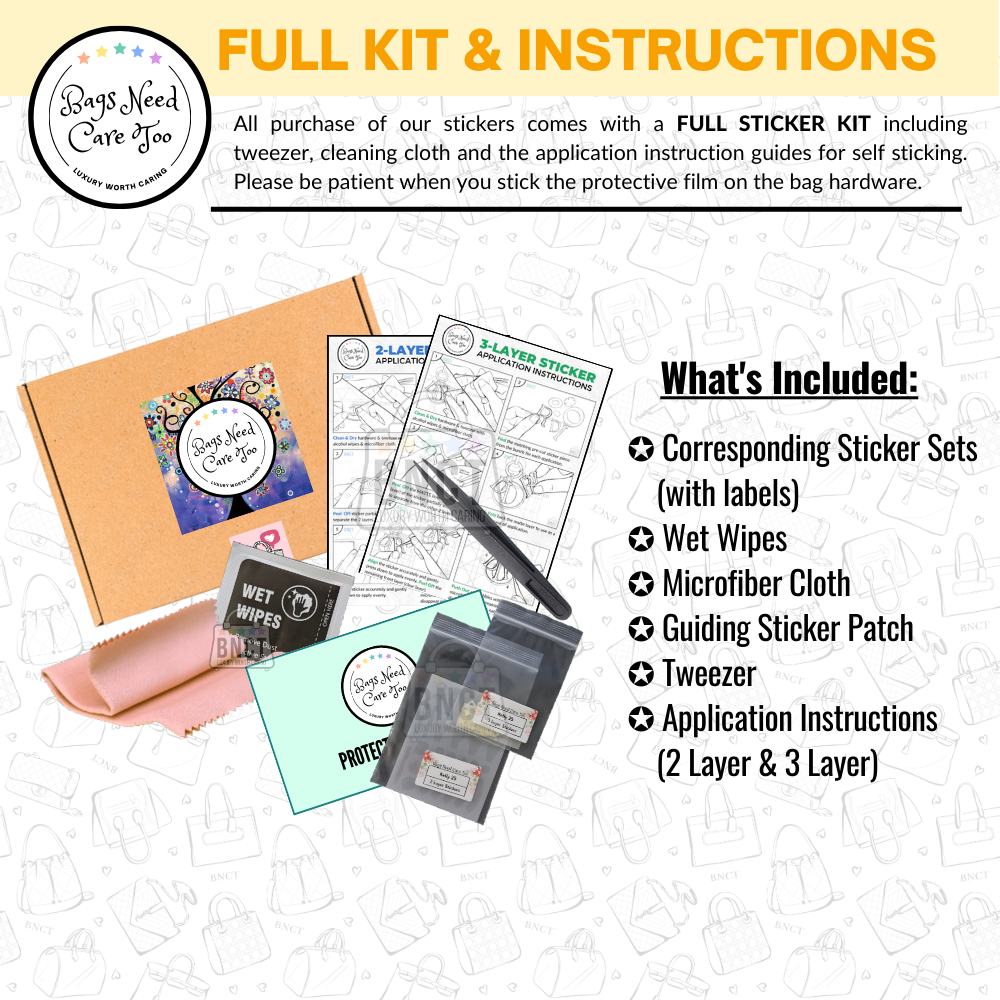 All bags deserve the care to hold its worth for investment or memories. Our handbag hardware protective sticker/film is a must-have! Made from precise laser-cut top-grade nano-film, this patented, and specially oleophobic coated protective sticker/film will keep all your exposed hardware metal bag parts free from scratches, smudges and scuffs. The sticker/film is fingerprint, water, blunt force and smudge resistant, and is HD clear transparent, maintaining the elegance and shine to your hardware metal portions of your bag.