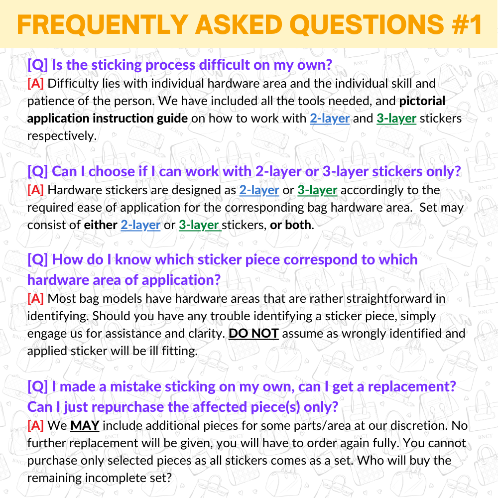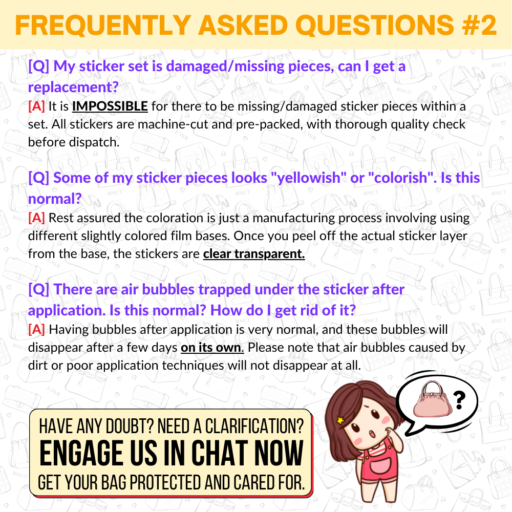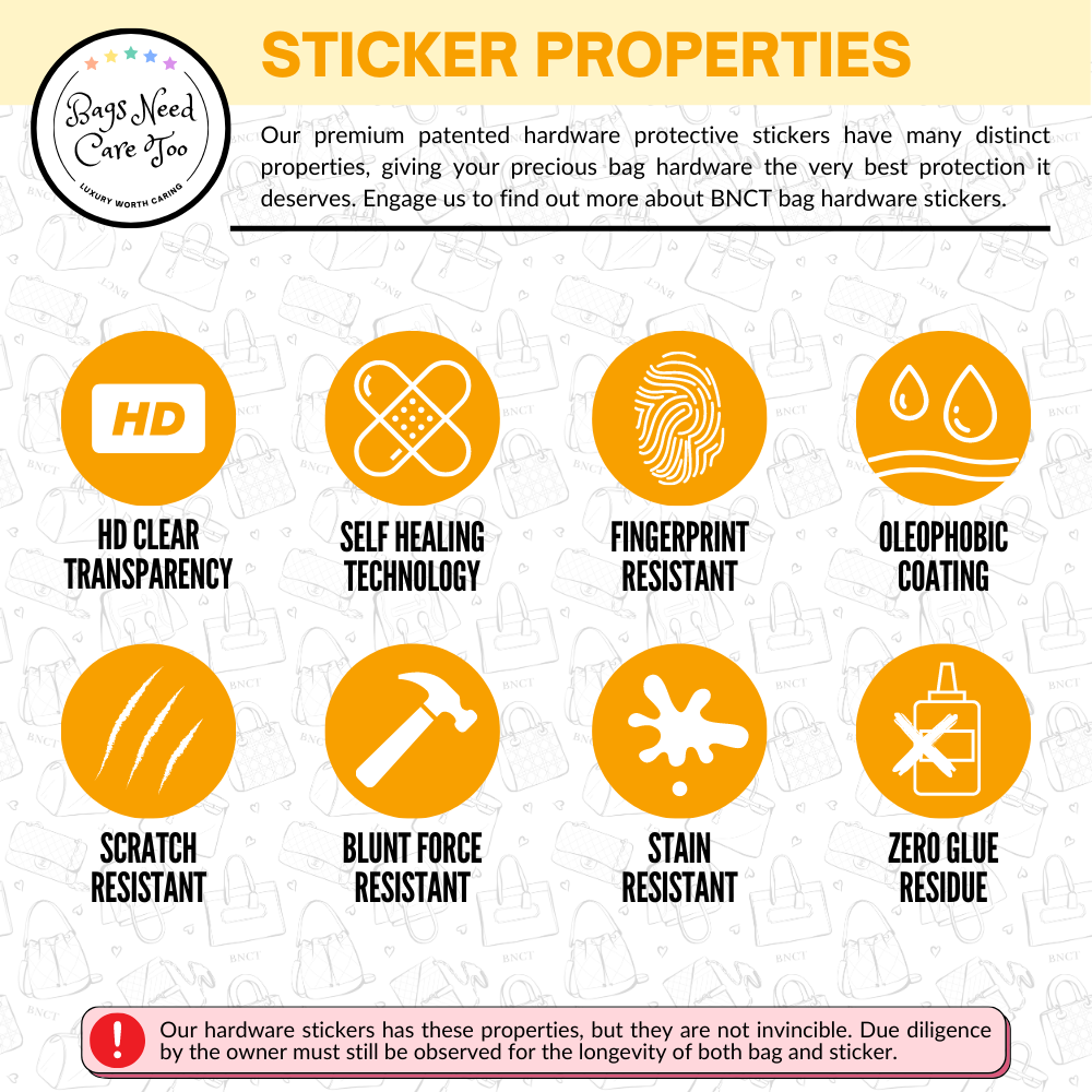 All bags deserve the care to hold its worth for investment or memories. Our handbag hardware protective sticker/film is a must-have! Made from precise laser-cut top-grade nano-film, this patented, and specially oleophobic coated protective sticker/film will keep all your exposed hardware metal bag parts free from scratches, smudges and scuffs. The sticker/film is fingerprint, water, blunt force and smudge resistant, and is HD clear transparent, maintaining the elegance and shine to your hardware metal portions of your bag.